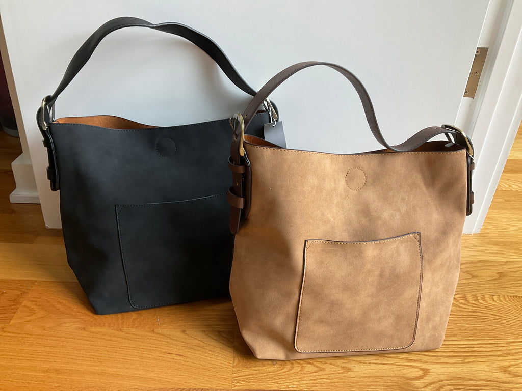 Faux suede hobo with faux leather adjustable shoulder strap in toffee, olive, black, or wheat